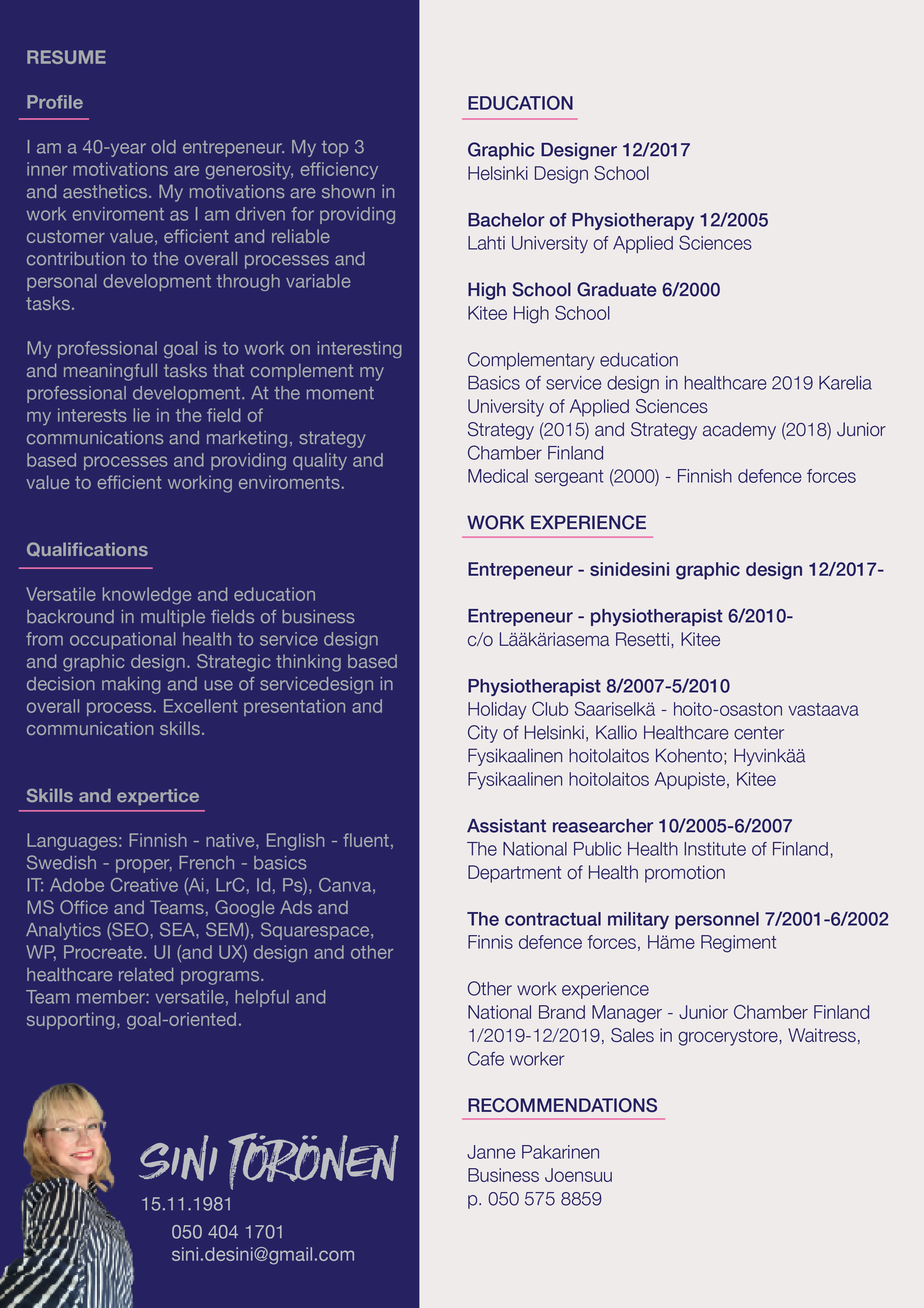Yrittäjänä olen toiminut vuodesta 2010 asti, vuodesta 2018 graafisena suunnittelijana fysioterapian jäädessä erilaiseksi osaksi yrittäjyyttä. Fysioterapian ja graafisen suunnittelun yhdistäminen on erikoinen yhdistelmä, mutta antaa monipuolisen pohjan graafiselle suunnittelulle: terapiatyö on luonut hyvät valmiudet niin ihmistuntemukseen, monipuoliseen näkemykseen työmaailman erilaisuudesta, ongelmanratkaisukykyyn kuin tavoitteelliseen suunnitteluun ja työhön.